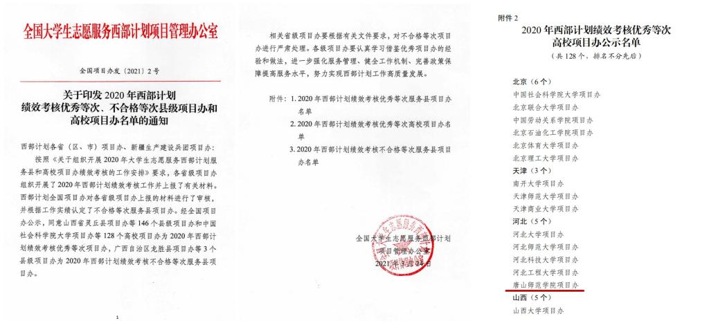 近日,全国大学生志愿服务西部计划项目管理办公室发布了《关于印发2020年西部计划绩效考核优秀等次、不合格等次县级项目办和高校项目办名单的通知》(全国项目办发〔2021〕2号)。经省级项目办考核上报、全国项目办评审和公示,我校项目办获评“2020年全国西部计划绩效考核优秀等次高校项目办”称号(省内共有5所高校获此殊荣),这是我校连续四年获此荣誉。